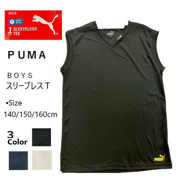 【商品説明】 商品名:プーマ男児DRYスリーブレス 素材:ポリエステル 100% サイズ:140/150/160cm カラー:ブラック/ホワイト/ネイビー ベトナム製 効能:DRY吸水速乾 人気ブランド プーマ のスリーブレスTシャツ。