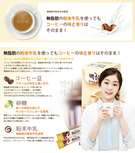製造国 韓国 マキシム ホワイトゴールドの特徴 コーヒー豆 無脂肪の牛乳を使ってもコーヒーの味と香りをいかすためにコーヒー豆を厳選し、 豆の特製に 合わせてロースティングをするマキシムだけの SPR (SPECIALIZED PROFILE ROASTING) 工法を使用しました。