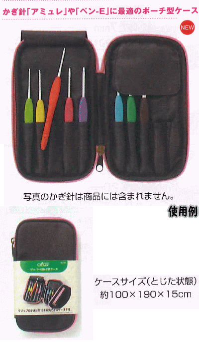 収納力のあるジッパー付きかぎ針ケース サイズ:(閉じた状態で)約100x190x15cm グリップ式かぎ針が10本収納できます。